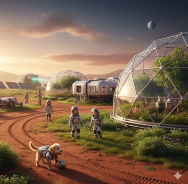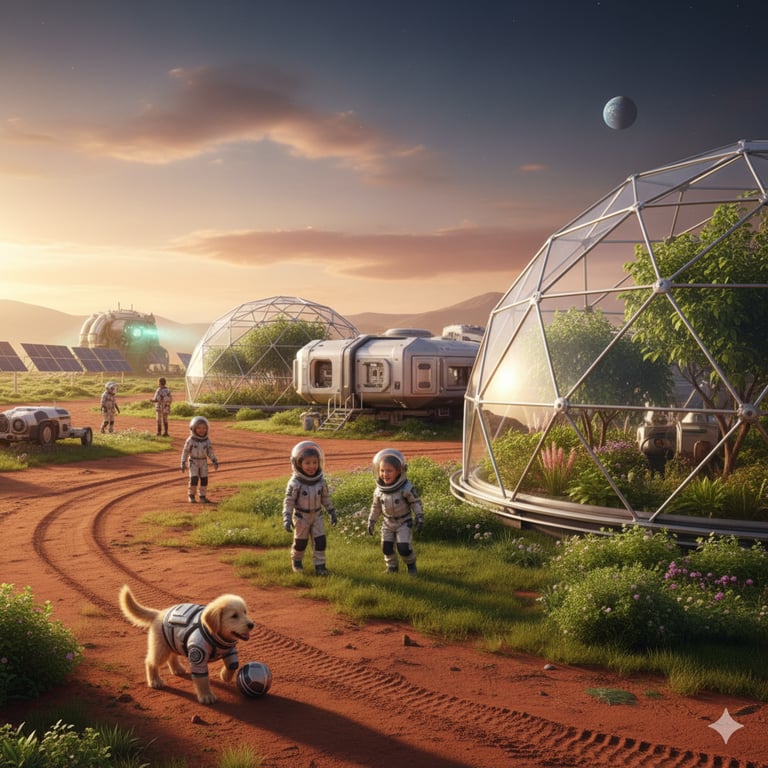 Nesta imagem imagino como seria uma colonização futura em marte, com uma vegetação iniciando e crianças brincando