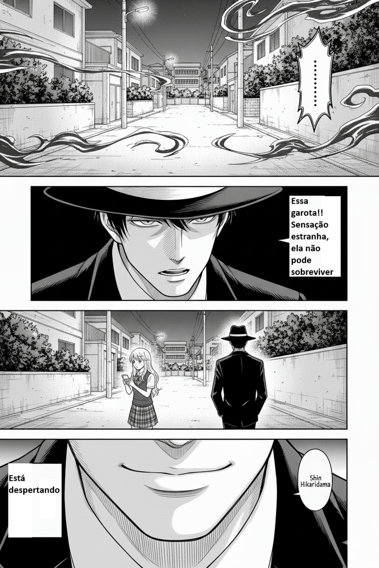 Atrás de um poste, um homem de terno escuro observava em silêncio, os olhos frios refletindo o brilho da energia.