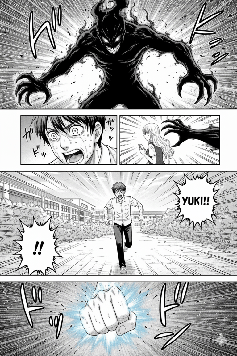 Uma sombra gigantesca se projetava atrás de Yuki — uma criatura feita de escuridão, com garras longas e olhos como fendas de fumaça.